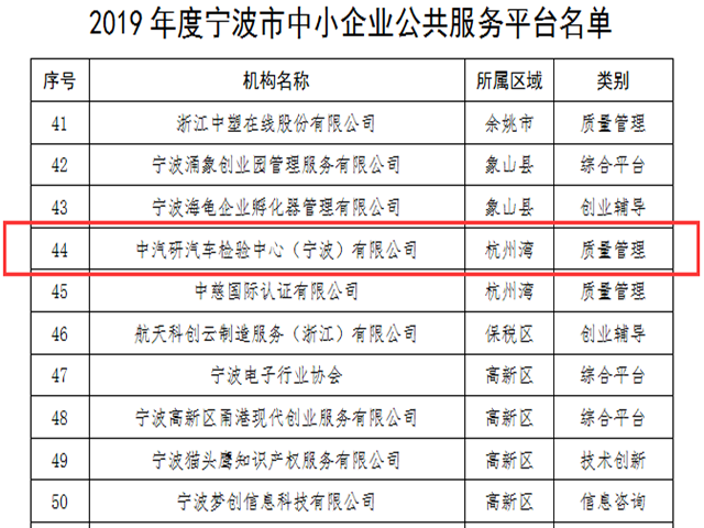 寧波汽車檢測中心杭州灣分中心被認定為 “2019年度寧波市中小企業公共服務示范平臺”